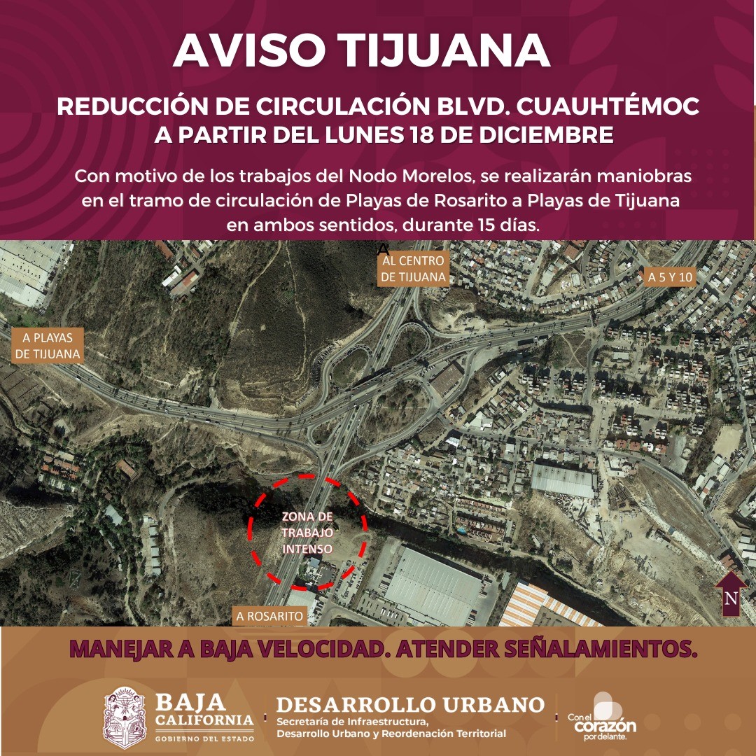 A partir del lunes 18 de diciembre, se reducirá la circulación en el bulevar Cuauhtémoc en el tramo de Playas de Rosarito a Tijuana en ambos sentidos, informó la Secretaría de Infraestructura, Desarrollo Urbano y Reordenación Territorial (SIDURT).