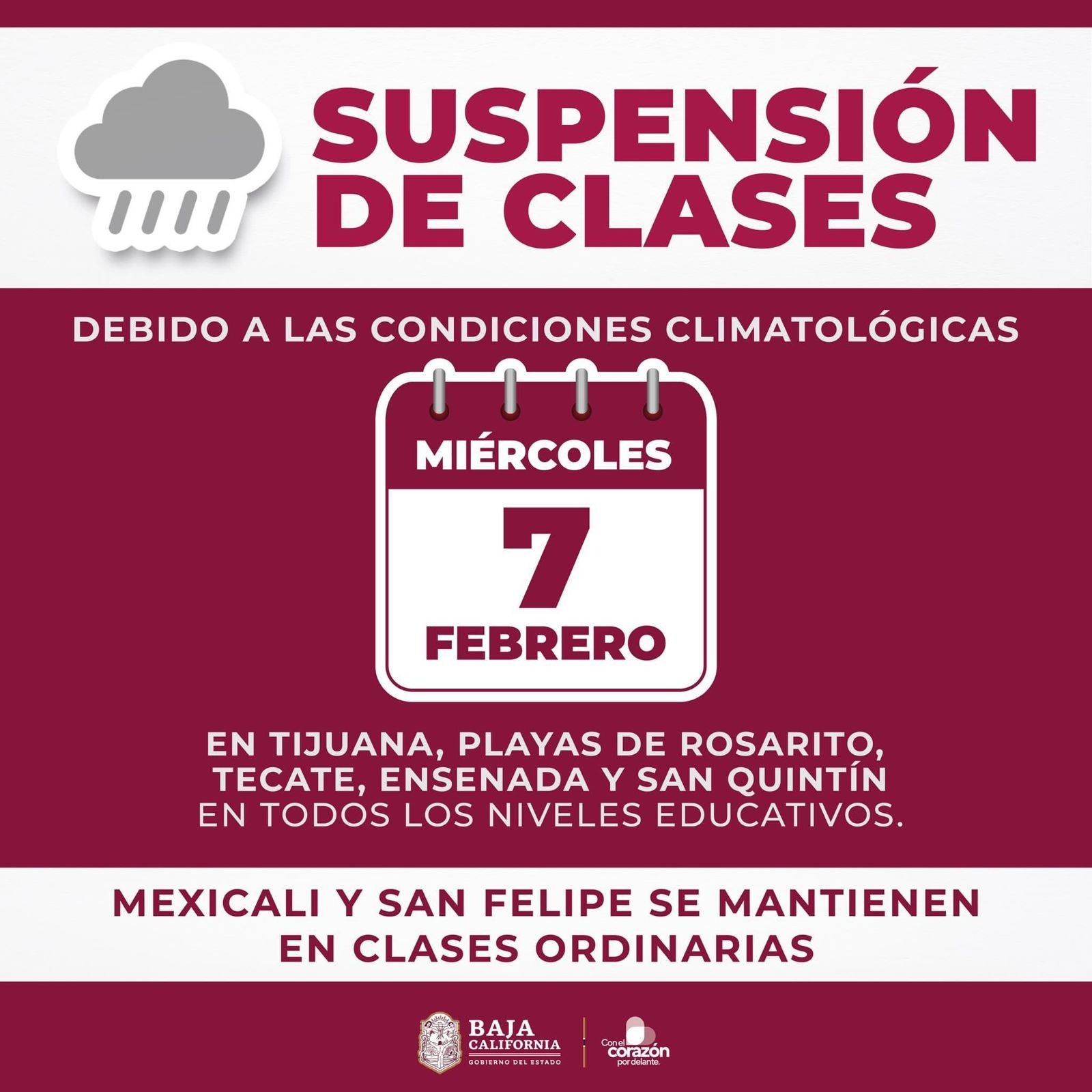 Este 7 de febrero los municipios de Tijuana, Ensenada, Tecate, Playas de Rosarito y San Quintín – donde según los pronósticos acontecerá el fenómeno meteorológico con mayor intensidad- continuarán con la suspensión de actividades en las escuelas según lo informado por las autoridades estatales.